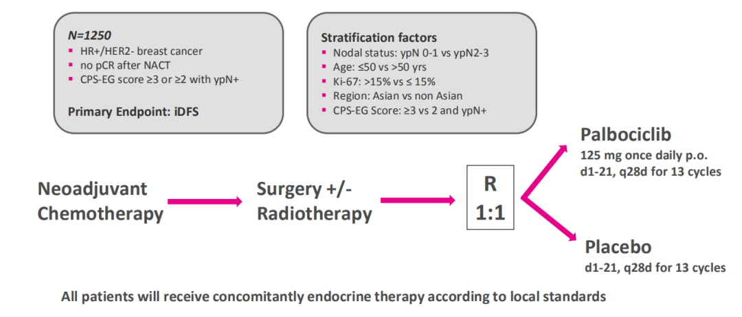 PENELOPE-B(NCT01864746)是一项双盲、安慰剂对照、Ⅲ期研究,研究对象为中心确诊的HR+、HER2-原发乳腺癌患者,在接受含紫杉类的新辅助化疗后未获得病理完全缓解(pCR),且有复发高风险(CPS-EG评分≥3或2且ypN +)。在新辅助化疗和局部区域治疗完成后,除标准内分泌治疗外,患者被随机(1:1)分配到每天接受palbociclib 125mg+ET(palbociclib组)或安慰剂+ET(安慰剂组),每周期28天,在第1-21天接受治疗,共13个周期。根据淋巴结状态(手术时)、年龄、Ki67、全球区域和CPS-EG评分随机分层。主要终点是无侵袭性疾病生存期(iDFS)。基于前两次的中期分析,最终分析计划在290个iDFS事件发生后进行,疗效界值设定为P<0.0463。主要的次要终点包括不包括第二原发侵袭性非乳腺癌的iDFS、总生存率和安全性。