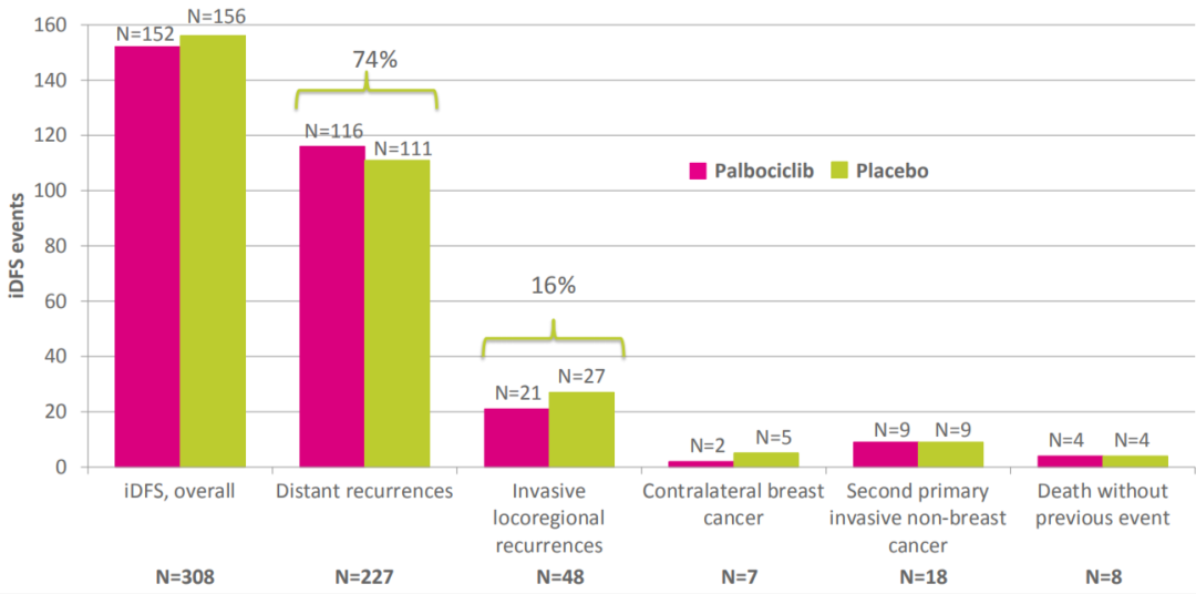 该研究的iDFS终点之前经过两次期中分析,第一次期中分析中重新校正了样本量和事件数。第二次期中分析是有效-无效性分析,这次是最终分析。在最终分析中,该研究设定了一个名义上的疗效界值P<0.0463,但研究结果显示,没有达到pCR的有高危复发风险(如CPS-EG评分≥3或2伴有淋巴结残留阳性)病人的iDFS,在最终一次随访过程当中(中位随访时间42.8个月),Palbociclib强化组仍然没有达到统计学差异,P值为0.525。