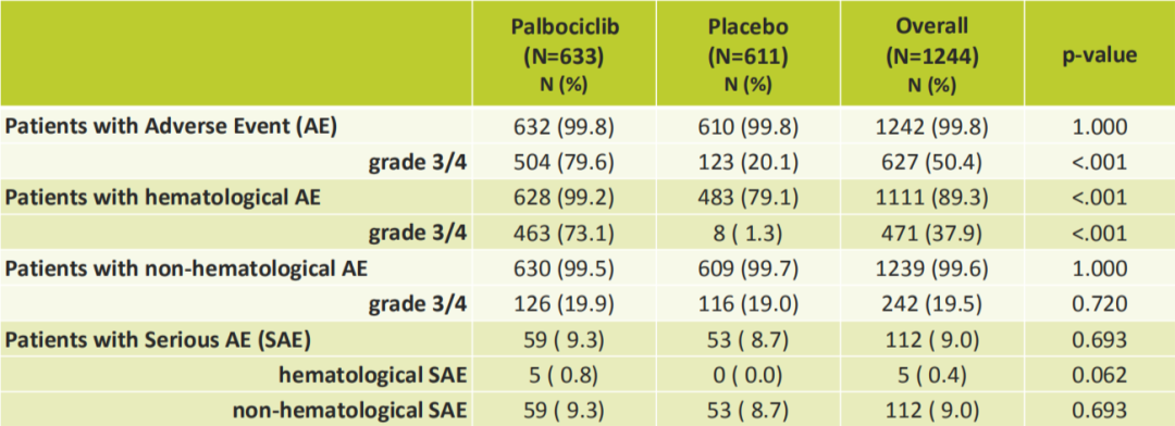 用药依从性方面,palbociclib组低于安慰剂组。不良反应方面,治疗期间无论血液学还是非血液学3~4级不良反应发生率palbociclib组均高于安慰剂组,但没有观察到新的不良反应发生。
