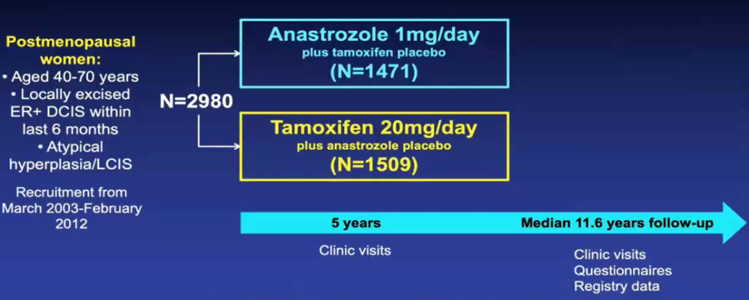 对2003年至2009年间诊断为局部切除的DCIS的绝经后妇女进行了一项为期5年的多中心随机试验,分别接受阿那曲唑1mg/天(N=1471)和他莫昔芬20mg/天(N=1509)。本试验的主要目的是确定阿那曲唑与他莫昔芬在预防复发方面的疗效,尤其是在5年治疗后的随访期间。次要终点包括复发类型、乳腺癌死亡率、其他癌症、心血管疾病、骨折、不良事件和非乳腺癌死亡。