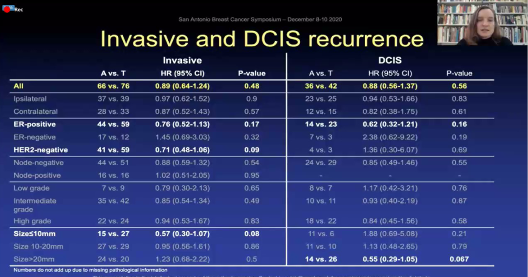 中位随访11.6年(IQR 9.9至13.4)后,共记录了221例乳腺癌复发(7.4%)。在5年治疗期 (HR=0.82(0.53~1.27),P=0.37),或治疗后随访期(HR=0.91,95%CI:0.65~1.27,P=0.57),阿那曲唑对比他莫昔芬组总体复发率没有差异,阿那曲唑组和他莫昔芬组分别有102例 (6.9%)和119 例(7.9%)乳腺癌复发(HR=0.87,95%CI:0.67~1.14,P=0.32)。与他莫昔芬相比,使用阿那曲唑的雌激素受体(ER)阳性乳腺癌减少了28%(58例 vs.82例;HR=0.72,95%CI:0.52~1.01,P=0.056),但并未达到显著水平。