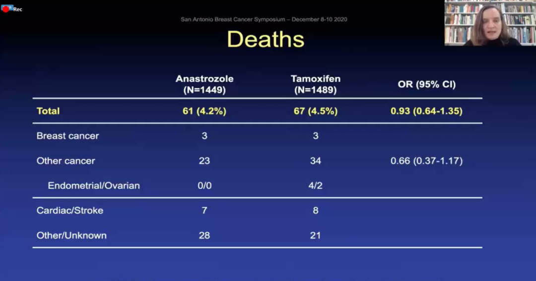 经过将近12年的随访,同样也看到了在一些其他特征上的差别,如非乳腺癌的肿瘤发生,包括子宫内膜癌、卵巢癌等,阿那曲唑组更少。但是阿那曲唑组的骨折发生率和短暂性脑缺血发作(TIA)/卒中却更高。