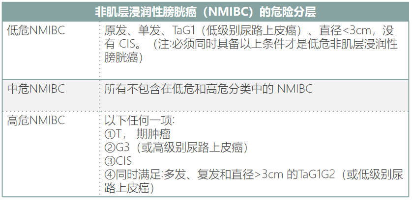 非肌层浸润性膀胱癌(NMIBC)指局限于膀胱黏膜层(Tis、Ta)及固有层(T1),且肌层未见浸润的膀胱乳头状恶性肿瘤,按照危险分层可分为低危、中危、高危NMIBC。