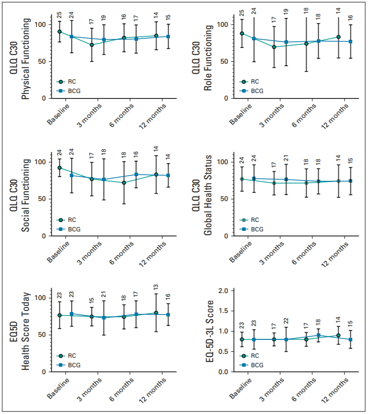 对于高危NMIBC患者,目前主要推荐经尿道膀胱肿瘤切除(TURBt)术后膀胱灌注卡介苗(BCG),预防复发及进展。反复复发或多发,以及进展为MIBC的患者,可考虑行膀胱根治性切除术。一项来自英国的多中心前瞻性随机试验(BRAVO-Feasibility研究),对比了高危NMIBC患者以维持卡介苗膀胱灌注治疗(mBCG)或根治性膀胱切除术(RC)的可行性。这项研究从英国Sheffield大学泌尿外科中心等11家单位招募了50例初诊高危NMIBC患者,随机分为mBCG治疗组和RC组。在mBCG组中,23/25(92.0%)患者接受mBCG治疗,4例在mBCG诱导后NMIBC复发,3例在4个月时发生NMIBC,4例接受RC治疗,2例患者术后存在转移性膀胱癌。在RC组,20例(80.0%)患者均直接接受膀胱根治性切除术,结果发现其中有5例(25.0%)无肿瘤,13例(65.0%)为高危NMIBC,2例(10.0%)为MIBC。随访时,RC组所有患者均无疾病。不良事件主要是轻微的,且分布均匀,mBCG患者的不良事件发生率为65.2%(15/23),RC组为65%(13/20)。12个月时,两组患者的生活质量(QOL)大致相似。▲利用EQ5D和EORTC QLQ-C30评估患者健康相关生活质量这项小规模的多中心研究提示,大约10%的高危NMIBC患者存在致命疾病,可以通过一期根治性膀胱切除得到更好的治疗。相反,更多的患者适合保留膀胱,虽然也有部分患者不同程度复发或进展后需要行根治性切除,但这些患者获得了一段时间保留膀胱所带来的生活质量改善。