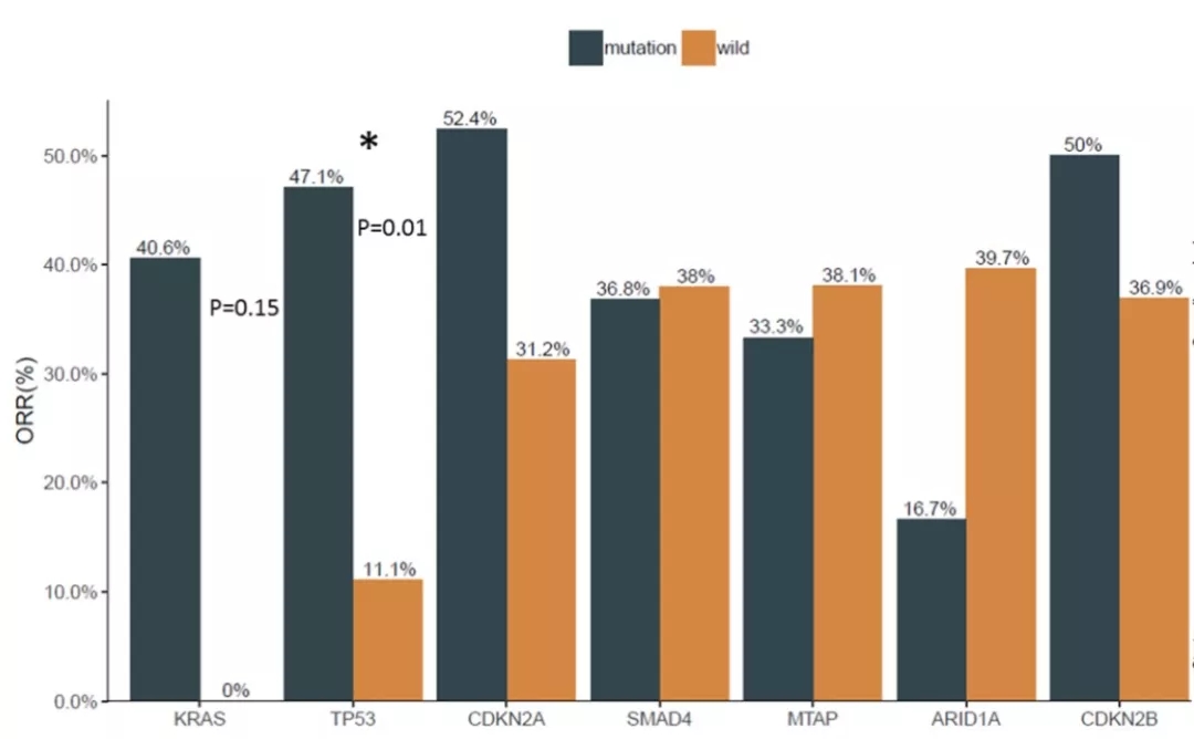 本研究对101例患者的组织样本进行了NGS检测,其中58例(57.4%)为原发肿瘤组织,43例(42.6%)为转移肿瘤组织。截至目前,有72例患者可进行疗效分析,ORR和DCR分别为38.2%和77.9%,原发病灶和转移病灶患者的ORR和DCR相似。PFS和OS分别为176天和308天。其中KRAS(91.9%)、TP53(76.8%)、CDKN2A(32.3%)和SMAD4(26.3%)突变频率最高。3例(3.0%)患者检出胚系致病性BRCA2突变,2例(2.0%)患者检出体细胞BRCA2突变。对于KRAS来说,错义突变导致的单氨基酸替换主要发生在G12位点(88.1%),Q61位点(4.0%)和V14位点(1.0%)的频率较低。在G12位点,发现了5种不同的氨基酸替换,其中G12D(37.6%)为主要突变,G12V(32.7%)、G12R(11.9%)、G12C(3.0%)和G12A(1.0%)为次要突变。TP53突变亚组(-alt,47.1%)的ORR显著高于TP53野生型亚组(-WT,11.1%) (P=0.01)(见下图)。CDKN2B-野生型患者的OS显著长于CDKN2B-突变型患者,分别为323天和180天(P=0.029)。