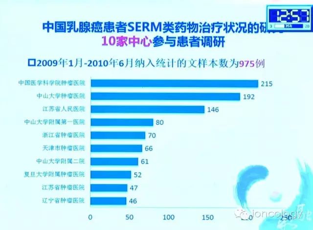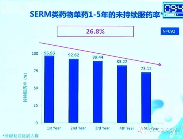 由中国抗癌协会乳腺癌专业委员会主任委员徐兵河教授牵头进行的中国乳腺癌患者SERM类药物治疗状况的研究,针对绝经前受体阳性乳腺癌采用内分泌治疗的依从性进行了相关调查,袁芃教授在此次大会上发布了主要结果。从研究数据中可以看出,患者的依从性随治疗时间的延长逐渐降低,进而直接影响SERM类药物在乳腺癌辅助治疗中的疗效。患者依从性差未持续服药的原因主要有以下几点:药物不良反应、年龄、家人知晓与否以及医生对患者的告知。因此要提高依从性,医生治疗前应给患者足够的指导教育、加强随访,使用更安全有效的治疗药物并加强副反应管理,同时患者应提高自身的心理素质、增强信心。