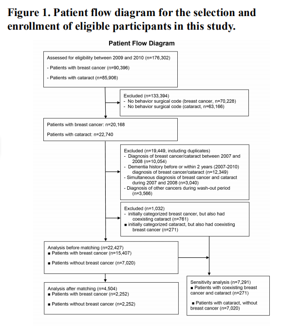 分别从入组的90396名乳腺癌患者和85906名白内障患者中,排除了无行为规范的患者。在配对前,对15407名乳腺癌患者和7020名对照组的数据进行了分析。在对并发症和年龄进行匹配后,两组均包含2252名患者。