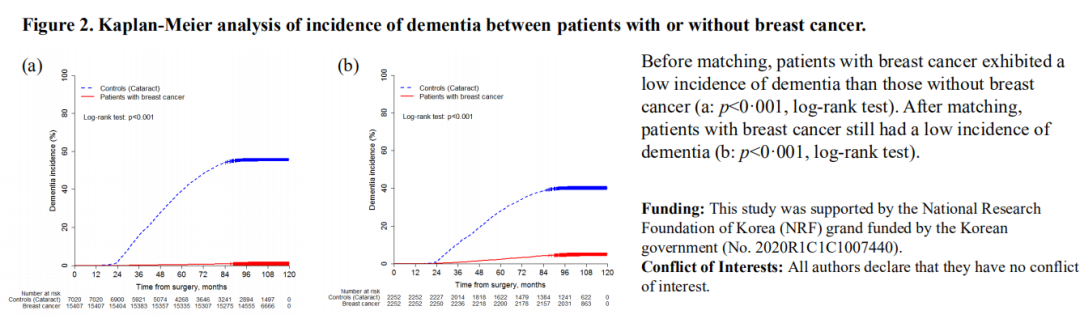 在匹配之前,乳腺癌患者比非乳腺癌患者表现出低痴呆发生率(a: p<0.001,log-rank检验)。匹配后,乳腺癌患者痴呆的发生率仍然较低(b: p<0.001,log-rank检验)。