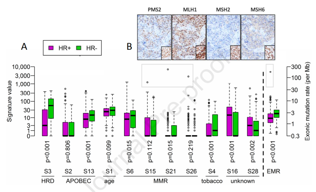 图1. HR阳性和阴性乳腺癌突变特征的比较:(A)HR阴性和阳性肿瘤每个特征突变的绝对数;(B)免疫组化检测1例高EMR、高MMR相关信号S15、S21、S26的肿瘤微卫星不稳定性(MSI)