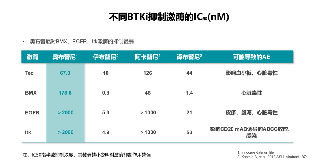 不同的BTK抑制剂对这些激酶的抑制活性不同。体外研究的数据(详见图1)显示:奥布替尼对于除BTK靶点以外的其他靶点抑制活性低,因此理论上,房颤这一类心脏毒性的发生率会比其他BTK抑制剂低。