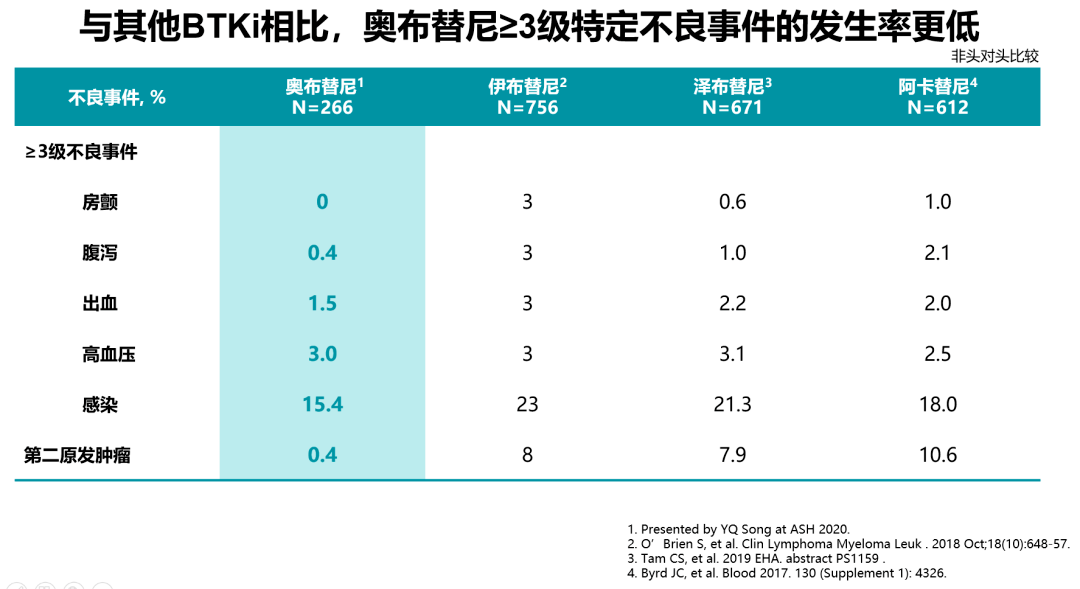 对于奥布替尼的房颤发生率,今年美国血液学会年会(ASH)上abstract 1140[6]针对5项有关奥布替尼单药治疗的266例B细胞淋巴瘤患者进行了安全性汇总分析。结果显示,仅有1例患者出现了1级的一过性房颤,无≥3级的房颤事件(详见图2)。