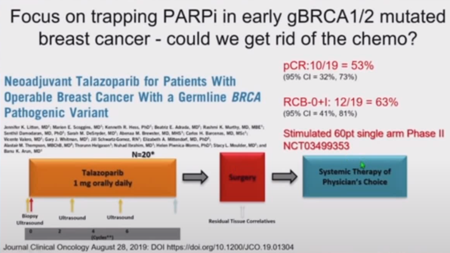 对于PARPi是否可以豁免化疗。袁芃教授指出,在BRCA基因突变或HRD患者使用PARPi单药新辅助治疗的小样本研究中,能看到PARPi取得较好的效果,pCR可达53%。然而HRD患者人群较小,研究样本量小,且既往的PARPi研究也显示了其安全性的问题。因此,目前仍无法使用PARPi完全取代化疗。