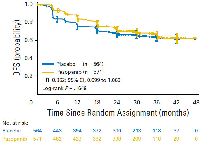 分组情况:初始剂量为800mg一天一次403例,其中Pazopanib组198例,安慰剂组205例。因为治疗中断率高于预期故将初始剂量由800mg调整为600mg一天一次1135例,其中Pazopanib组571例,安慰剂组564例。主要研究终点为Pazopanib 600mg的无疾病生存率disease-free survival, DFS,次要研究终点为总体生存率overall survival, OS以及生活质量评估。