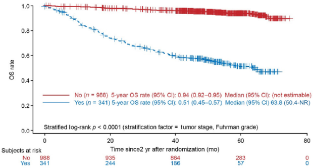 入组对象:经手术切除患肾的ccRCC肾癌患者1069名。病理分期为pT3-4或阳性结节病灶。根据UISS风险模型判定为高危风险人群。