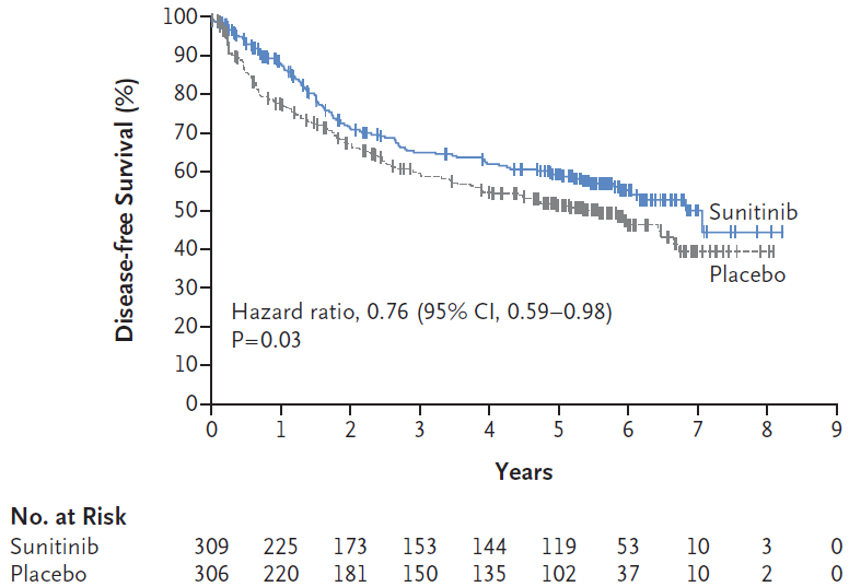 分组情况:分为1:1:1三组。Sunitinib组50mg一天一次,4/2方案;Sorafenib组400mg一天两次;安慰剂组。主要研究终点为无疾病生存率(disease-free survival, DFS)。
