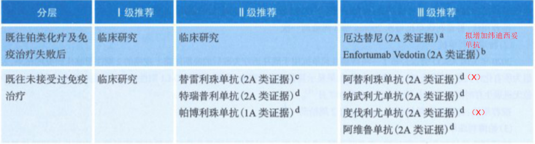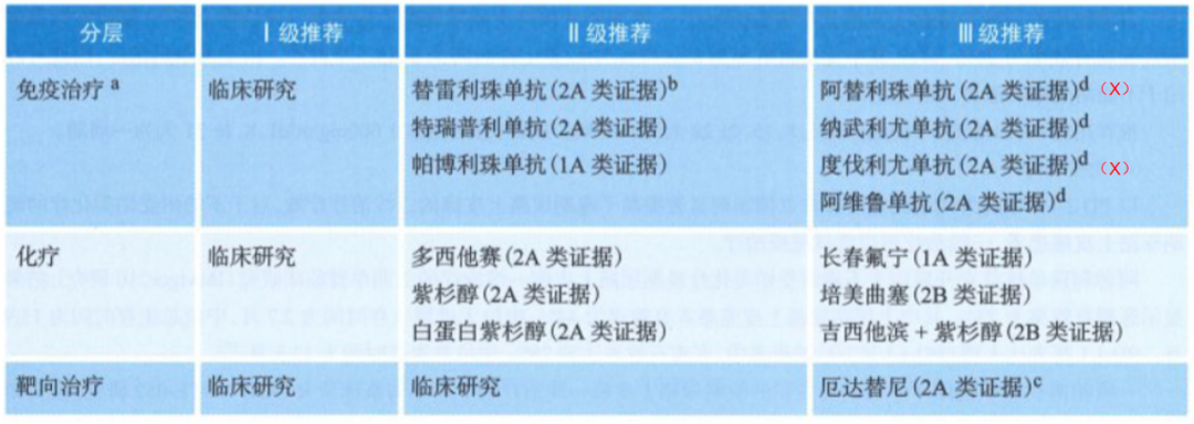 在免疫治疗方面,与二线治疗相似,由于阿替利珠单抗、度伐利尤单抗的二线适应症已被撤销,新版指南中三线治疗Ⅲ级推荐中也删除了这两个单免方案。