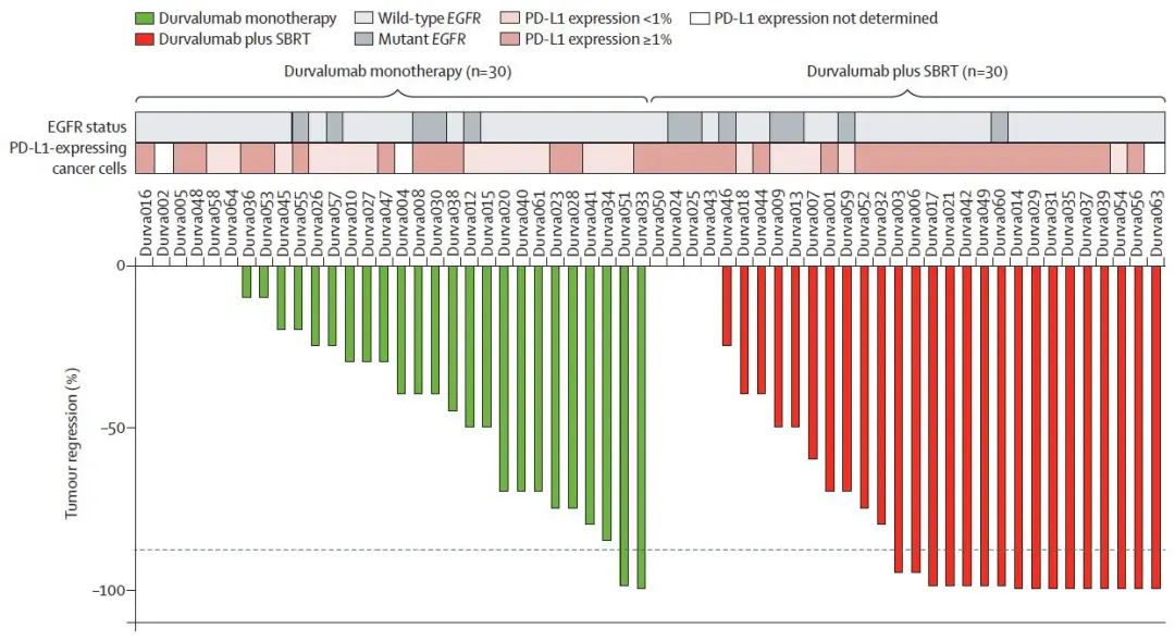 从2017年1月至2020年9月,共计96例患者接受筛选,60例患者入组,两组均有30例患者,基线特点均衡可比(除PD-L1表达水平外)。所有患者均至少接受一次Durvalumab单抗治疗,联合组患者至少接受一次放射治疗。