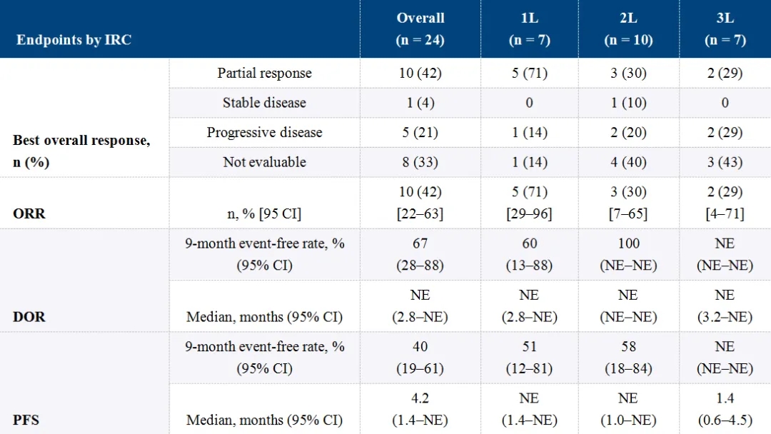 截至2020年11月,5例患者(1L,n=2;2L,n=2;3L,n=1)的治疗持续>1年。IRC在总体患者中评估的客观缓解率(ORR)为42%(10/24),一线治疗的ORR为71%(5/7),二线ORR为30%(3/10),三线为29%(2/7)(见表)。