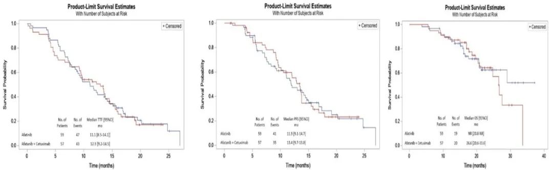 单药治疗组和联合治疗组分别入组59例和58例患者,两组患者基线特点均衡可比,全组96.6%的患者为腺癌,分别有55.6%和40.2%的患者携带19del或21L858R突变。数据分析时,两组分别有79.2%和73.3%的患者出现疾病进展。中位TTF分别为11.1个月和12.9个月,中位PFS分别为11.9个月和13.4个月,ORR分别为76.3%和77.2%,DCR分别为98.3%和93.0%,12个月的OS率为87.9%和89.4%,两组中位OS分别为26.6和未达到差异,均无统计学意义。考虑到阿法替尼基础上联合西妥昔单抗有很大可能不能给患者带来获益,因此,独立评审委员会建议提前终止本研究(图1)。
