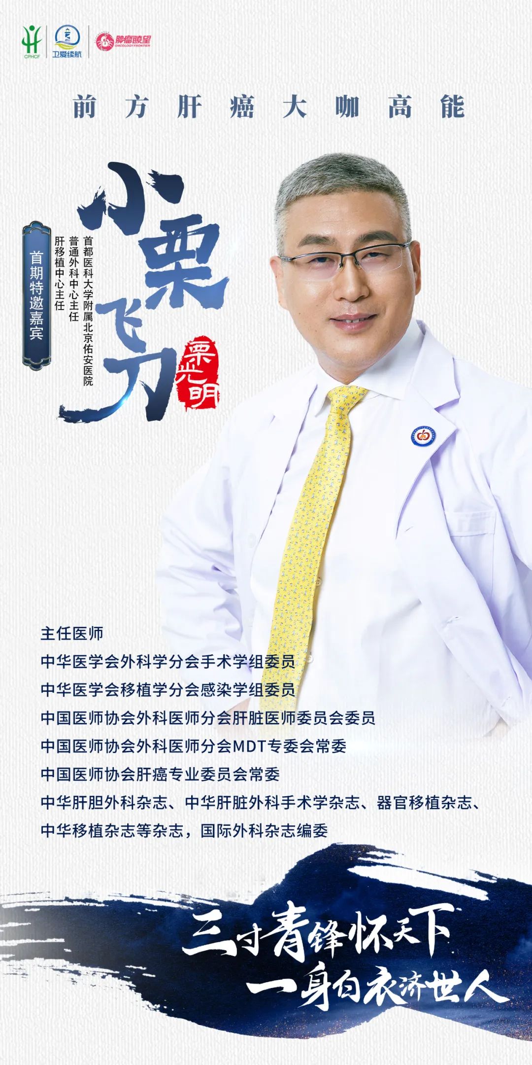 首期特邀嘉宾为我国肝胆外科著名专家栗光明医生。栗医生立足于我国乃至亚洲重要的传染病专科医院——首都医科大学附属北京佑安医院,该院具有肝病专科特色,形成了从肝炎、肝硬化到肝癌等所有肝病的预防和治疗完整链条。三寸青锋怀天下,一袭白衣济世人。栗医生作为首都医科大学附属北京佑安医院普外中心和肝移植中心主任,尤其擅长肝胆疾病的外科诊治,特别是肝癌、肝硬化、胰腺癌、胆囊癌以及胆管癌的外科治疗以及肝脏移植手术,每年肝移植手术超过100例次,肝癌手术超过300例次,胰腺肿瘤手术100例次,被患者朋友们亲切地称为“小栗飞刀“。
