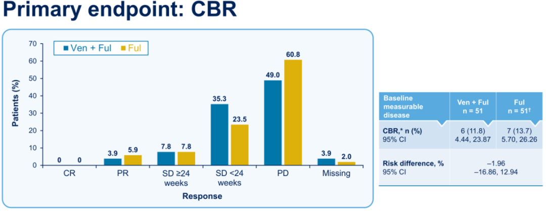 研究入组患者年龄≥18岁女性,针对既往接受过CDK4/6抑制剂、≤2线内分泌治疗且未接受过化疗的ER+/HER2-晚期乳腺癌。患者1:1随机分为VEN(口服,800 mg每日)+ FUL组或FUL单药组,治疗至疾病进展、不可耐受的毒性、撤回知情同意、死亡或定义的研究终止。患者根据既往治疗线数(1线 vs 2线)和BCL2状态(high vs low)进行分层。主要研究终点为临床获益率(CBR),次要终点为无进展生存期(PFS)和总生存期(OS),同时进行安全性和亚组分析。