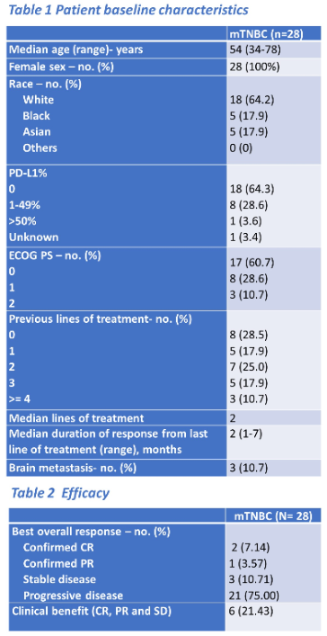 结果:该研究共收入了28位mTNBC患者,18例(64.3%)为PD-L1阴性肿瘤。中位年龄为54岁(34~78岁)。既往化疗中位线数为2(0~6),其中8例(28.6%)接受超过三线化疗,3例(10.7%)有脑转移。6例(21.43%)患者有临床获益,2例CR(7.1%)、1例PR(3.57%)和3例SD(10.7%)。临床获益患者存在持久性,中位DoT为383天(195~1195天)。