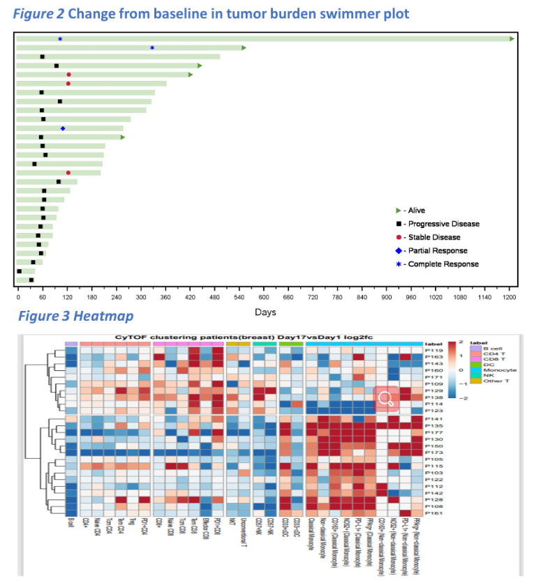 方法:在这项单臂、开放二期试验中,mTNBC患者接受原位溶瘤病毒ADV/HSV-tk (5x1011vp)瘤内注射,然后对注射的肿瘤部位进行SBRT治疗,随后用帕博利珠单抗维持治疗,直到病情进展或出现无法忍受的毒性。主要终点是临床获益率(根据RECIST1.1版对CR、PR和SD进行评估)。次要终点包括治疗的持续时间(DoT)和安全性。同时检测外周血CYTOF(D1、D7和D38),配对活检组织(D1和D17)进行35个细胞表面标志物组织影像细胞术(IMC)检测,以进行免疫相关分析。
