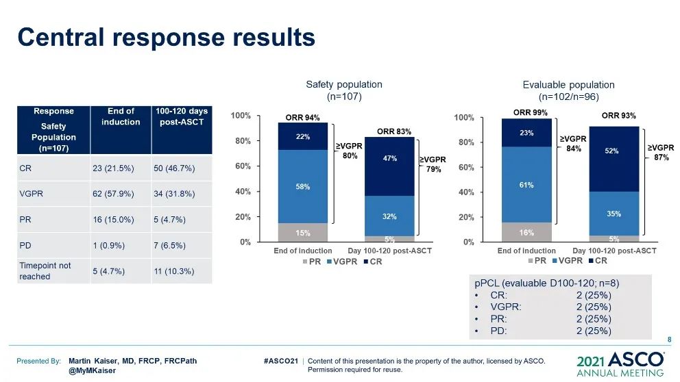 安全人群中107名患者的中位随访时间为22.2个月(95%置信区间:20.6-23.9)。两名患者在诱导期间因感染死亡。诱导结束时可从81%的患者中获取适合通过流式细胞术(10-5灵敏度)进行MRD评估的骨髓抽吸物,ASCT后100天时这一患者比例为78%。诱导治疗结束后,意向治疗人群的响应为94%总缓解率(ORR),22%完全缓解(CR)、58%极佳部分缓解(VGPR)、15%部分缓解(PR)和1%疾病进展(PD),5%的患者未能到达时间点(timepoint not reached,TNR:退出、不符合标准或死亡)。ASCT后100天时ORR为83%,CR为47%,VGPR为32%,PR为5%,PD为7%,TNR为10%(见图1)。