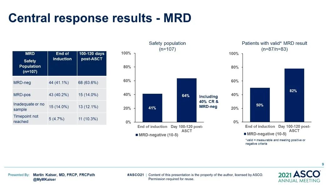 OPTIMUM/MUKnine研究纳入了从2017年9月至2019年7月期间来自英国39家医院的107名超高风险新诊多发性骨髓瘤和浆细胞白血病患者。UHiR NDMM患者的入组标准为中心试验遗传分析显示大于等于2项高风险病变:t(4:14)、t(14;16)、t(14:20)、gain(1q)、del(1p)、del(17p)或通过基因表达SKY92(SkylineDx)分析;PCL患者入组标准为循环浆母细胞大于20%。患者接受了多达6个周期的Dara-CVRd诱导、用硼替佐米增强的HDMEL和ASCT,随后进行了18个周期的Dara-VR(d)巩固和Dara-R维持。主要试验终点为ASCT治疗后的微小残留病(minimal residual disease,MRD)状态和无进展生存期。次要终点包括反应、安全性和生存质量。