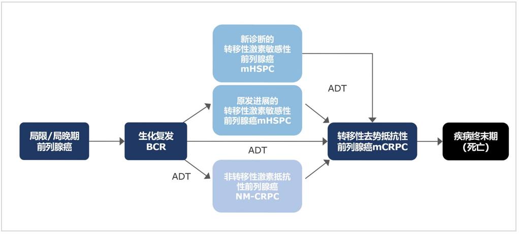 临床上,可将前列腺癌的疾病过程大致分为:局限/局晚期前列腺癌→生化复发(BCR)→mHSPC或NM-CRPC→mCRPC→疾病终末期(死亡)。随着疾病进展到mHSPC或NM-CRPC阶段,死亡风险增加3倍[9]