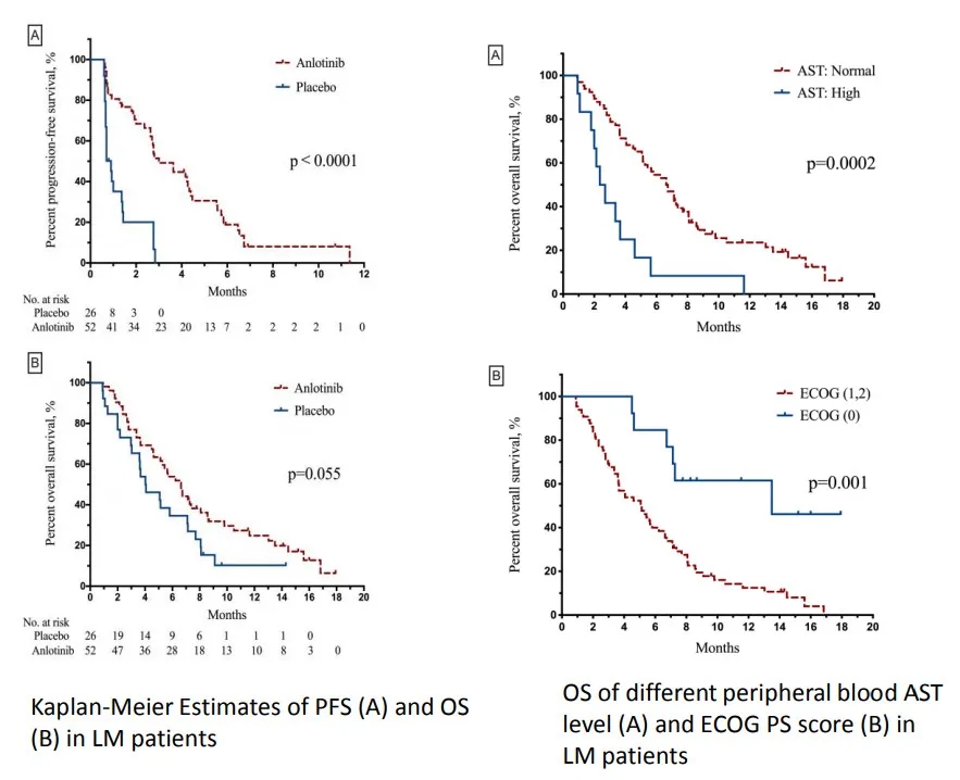 与安慰剂(中位PFS:0.9个月;95% CI:0.7-1.1)相比,给予安罗替尼治疗与肝转移患者有更长的PFS(3.0 个月;95% CI: 2.0-3.9)相关,风险比(HR)为0.23 (95 %CI: 0.12-0.42;P<0.0001)。