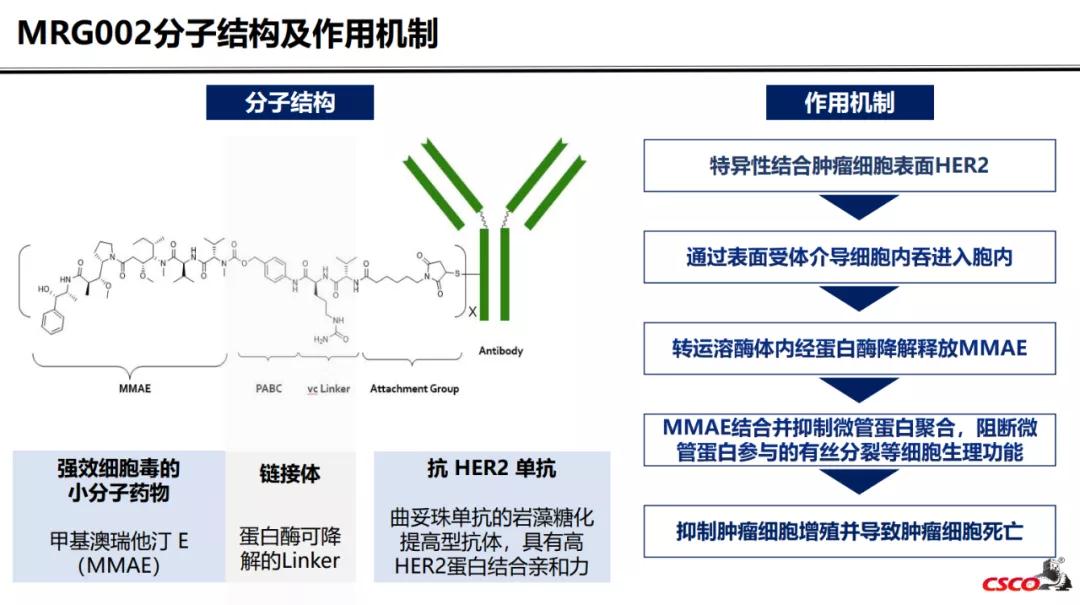 2021年9月25日,CSCO学术年会首日主会场中,CSCO大会主席同济大学附属东方医院(上海市东方医院)李进教授发布了题为《评价注射用重组人源化抗HER2单抗-MMAE偶联物(MRG002)在HER2阳性晚期实体瘤患者中的安全性、耐受性的剂量递增及扩展入组的临床研究》的重要报告,为我国抗HER2 ADC药物的发展画出了浓墨重彩的一笔。
