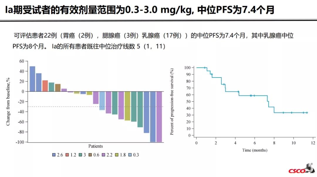 Ⅰa期剂量递增阶段25例患者分别接受0.3、0.6、1.2、1.8、2.2、2.6、3.0mg/kg Q3W的MRG002治疗,涵盖乳腺癌、腮腺癌、胃癌。在Ia 22例可评估实体瘤患者中,既往接受HER2靶向治疗患者比例为88%,既往中位治疗线数为5线,整体ORR 为45%,DCR为82%,中位PFS 7.4个月。提及此,李进教授认为:“对于多线治疗失败之后的患者,还能够取得如此长的PFS,其前景可期 !”