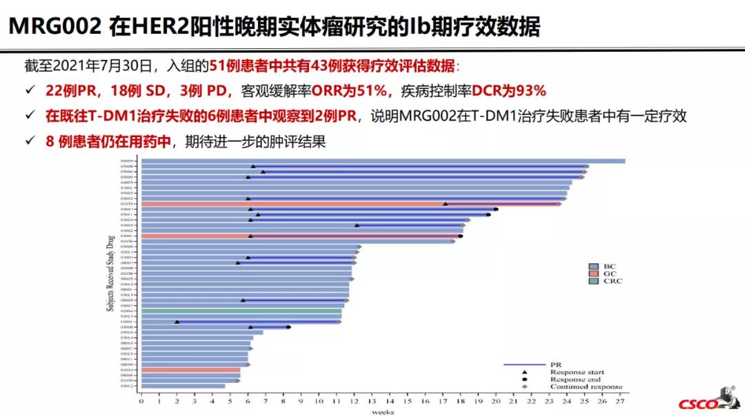Ⅰb期剂量扩展阶段入组的51例患者以2.6mg/kg MRG002开展研究,涵盖乳腺癌、胃癌,既往中位系统治疗5线,99%患者既往接受了抗her2治疗。在43例可评估患者中,22例PR、18例SD、3例PD,ORR为51%,DCR为93%;在既往T-DM1治疗失败的6例患者中观察到2例PR;另有8例患者仍在用药中,李进教授对后续观察结果寄予厚望。