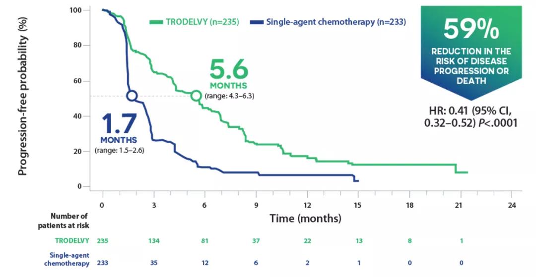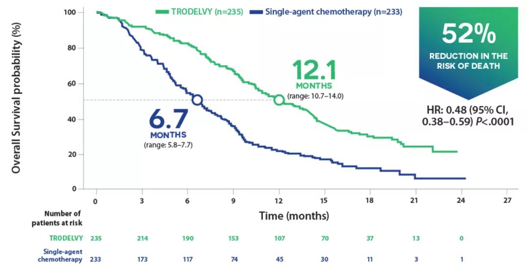 江泽飞教授:在戈沙妥珠单抗的国际3期ASCENT研究中,与医生选择的化疗对比,戈沙妥珠单抗用于经过≥2线治疗的无脑转移mTNBC患者,可显著延长PFS(5.6 vs 1.7个月,HR 0.41,95%CI:0.32~0.52)和OS(12.1 vs 6.7个月,HR 0.48,95%CI:0.38~0.59),提高ORR(35% vs 5%)。