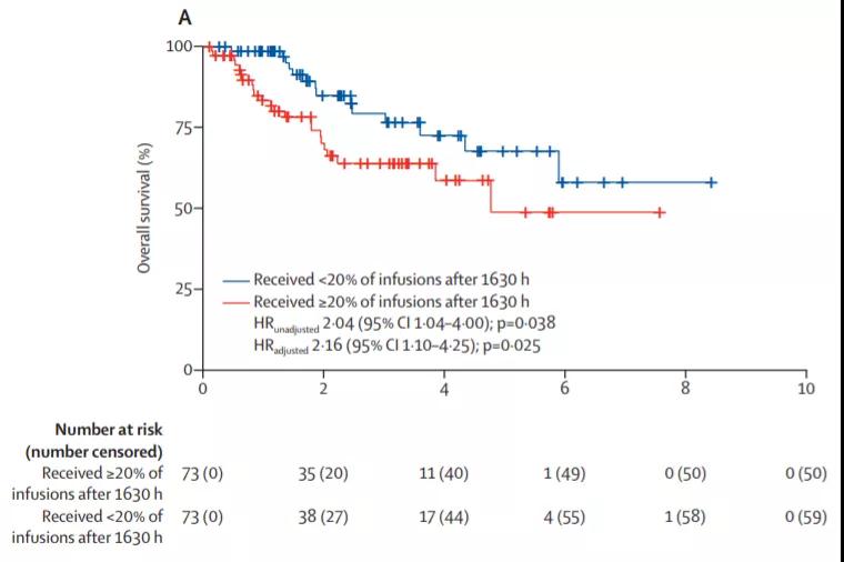 进一步进行倾向评分匹配,晚上输注较多和较少者各73例(n=146,女性54例,平均年龄58岁)。结果显示,与晚上输注较少者相比,晚上输注较多者的OS获益更差(4.8 vs NR,HR 2.04,95%CI:1.04~4.00;P=0.038)。校正后(HR 2.16)的多变量比例风险结果相似。