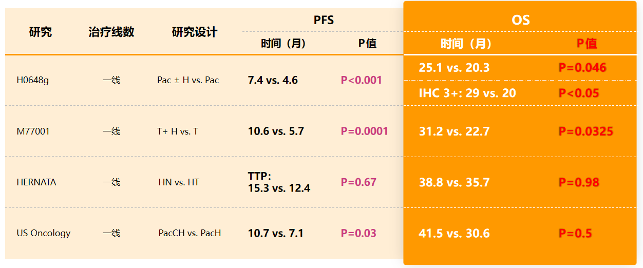 在Ⅱ期M77001研究中,曲妥珠单抗+多西他赛组的ORR为61%(95%CI:50%~71%),显著高于单用多西他赛组34%(95%CI:25%~54%)的ORR;两组中位OS分别为31.2个月和22.7个月(P=0.0325)。Ⅲ期H0648g研究同样证实了曲妥珠单抗在晚期一线治疗中的获益,曲妥珠单抗+化疗(Pac)相较于单独化疗可显著改善患者的PFS(7.4 vs 4.6个月)和OS(25.1 vs 20.3个月)。此外,非紫杉类化疗与曲妥珠单抗联合应用也获得很好的疗效,比如HERNATA研究中曲妥珠单抗+长春瑞滨对比曲妥珠单抗+多西他赛的TTP(15.3 vs 12.4个月)和OS(38.8 vs 35.7个月)均相似。