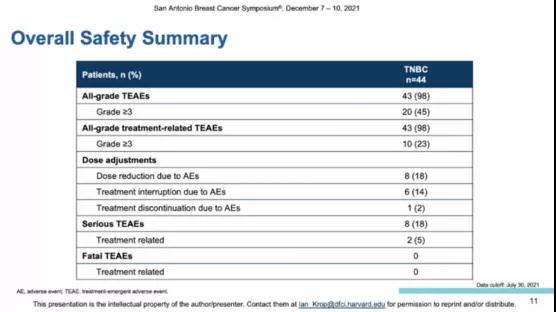 分别在95% 和35% 的患者中观察到全因治疗引起的不良事件 (TEAEs; 任意等级,≥ 3级);2例出现4级,未出现5级不良反应。最常见的TEAE(任何等级 ≥ 30%,等级 ≥ 3) 包括恶心 (58%,0%),口腔炎 (53%,9%),脱发 (35%,N/A),呕吐 (35%,2%) 乏力 (33%,7%)。1例患者中性粒细胞计数3度下降; 未观察到3级以上腹泻病例。未报告由独立委员会裁定的与治疗相关的间质性肺病病例。在5例患者中观察到严重TEAEs (12%); 没有TEAEs与死亡相关。9例患者由于口腔炎,乏力,粘膜炎症,干眼症,视网膜渗出液和视力模糊 (每个TEAE多次计数)下调剂量。三名患者因口腔炎,粘膜炎症,支气管炎和肌肉骨骼胸痛而出现剂量中断。无患者因不良事件中断治疗。