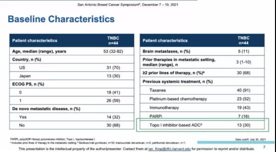 ■ 研究结果:截至2021年4月6日,数据截止,43例TNBC患者接受了 ≥ 1剂量的Dato-DXd,27例患者 (63% 例) 继续治疗,16例患者 (37% 例) 因疾病进展而停止治疗。中位年龄为53岁(范围为32-82岁)。41名患者(95%)接受了≥2个先前的治疗线;19例患者 (44% 例) 接受了先前的免疫治疗,7例患者 (16% 例) 接受了先前的sacituzumab govitecan。
