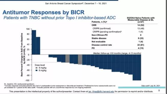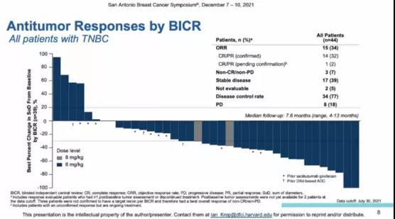 TROPION-PanTumor01研究Dato-DXd在TNBC患者中的应用,2021年1月8日第一次分析数据,通过盲目独立中心评估的在可评估的21例接受Dato-DXd[6 mg / kg(n = 19)或8 mg / kg(n = 2)]治疗的患者中,初步客观缓解率(ORR)为43%。观察到5个已确认的完全或部分缓解(CR / PR),还有4个正在等待确认的CR / PR。疾病控制率高达95%。