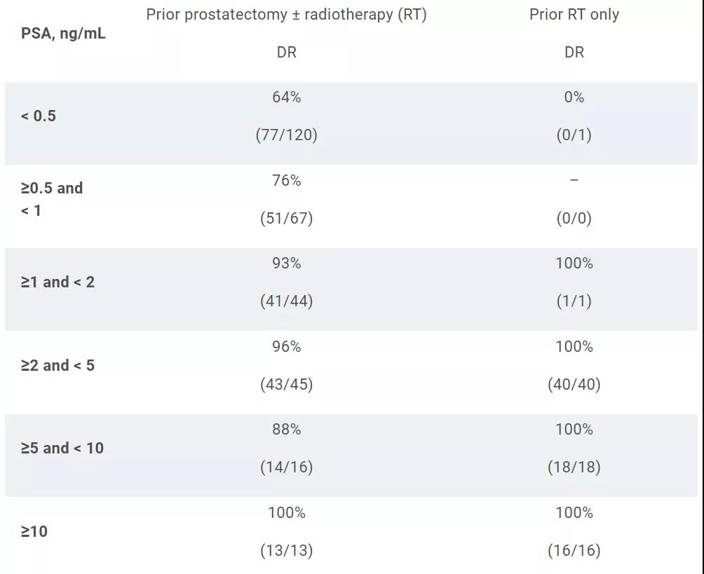 在纳入的389例患者(中位PSA 1.10 ng/mL)中,18F-rhPSMA-7.3的检出率(DR)为83%。不同治疗、不同PSA水平的检出率如下表所示。