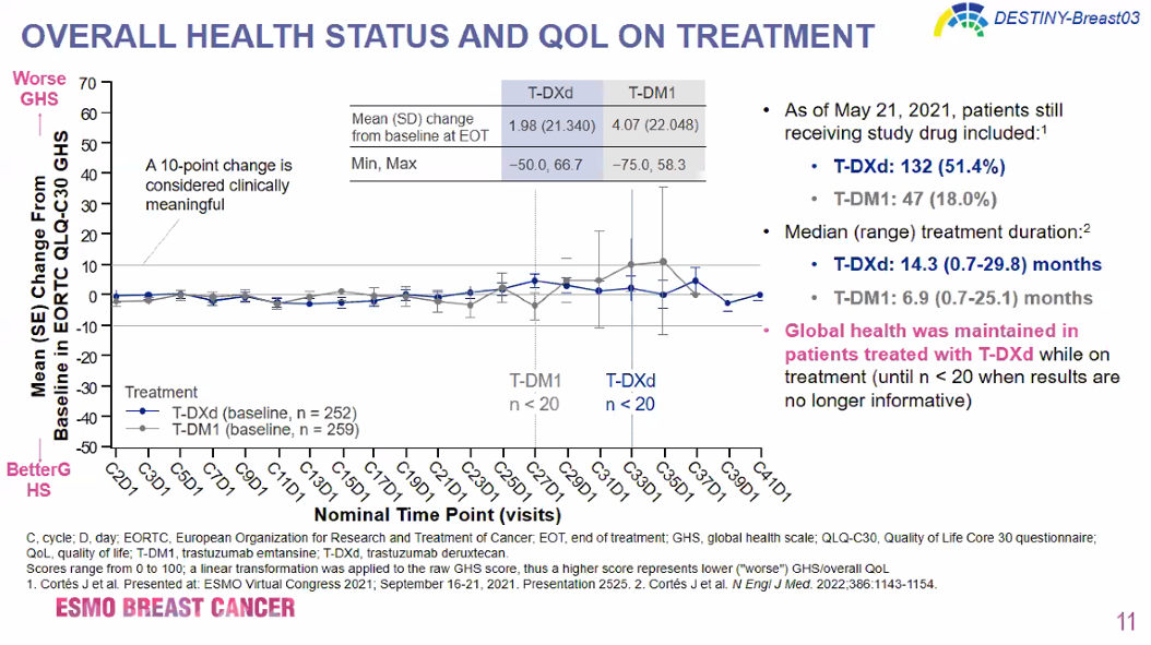 从本次ESMO BC会议上的数据我们可以总结出:T-DXd组治疗患者维持了总体健康状况和QoL水平,基于EORTC QLQ-C30 GHS量表(关注的主要PRO变量)和其他特定关注的子量表较基线的平均变化情况如下:T-DXd组14.3个月的中位治疗持续时间长于T-DM1组的6.9个月,对于所有预先设定的需要关注的PRO变量,TDD HR在数值上支持T-DXd优于T-DM1(HR范围:0.69~0.90)。表明T-DXd治疗可延迟mBC患者的QoL恶化。T-DXd的疼痛症状TDD延迟(HR,0.75)尤其显著,因为其对QoL有深远影响。