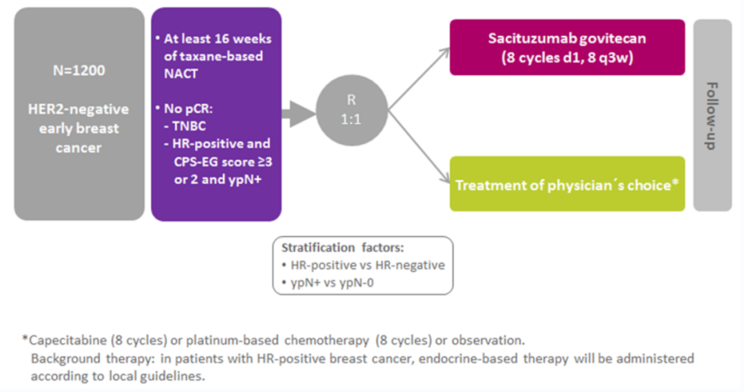 SASCIA(NCT04595565)是一项正在进行的Ⅲ期研究,入组的患者为HER2阴性,新辅助化疗后肿瘤残留,或激素受体(HR)阳性且伴有CPS+EG评分≥3,或激素受体(HR)阳性CPS+EG评分为2但新辅助化疗后ypN+,随机分组接受术后辅助强化sacituzumab govitecan或医生选择的治疗(TPC,卡培他滨,铂,观察)。2022年ESMO大会上,首次展示了预先计划的安全性中期分析的结果。