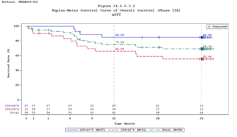 58例患者可评价疗效,最佳ORR和CRR分别为77.6%和53.5%。中位随访24个月,中位PFS和DOR分别为7.0个月和20.3个月,中位OS未达到,2年PFS,DOR和OS分别为38.8%,40.3%和69.3%。TRAE发生率为91.5%,其中55.9%为≥3级TRAE。任何级别CRS和NT的发生率分别为47.5%和20.3%,3-4级CRS和NT的发生率分别为5.1%和3.4%。