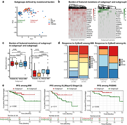 对100个改变最多的基因的主要成分分析显示,PCD患者主要可以分为2个临床亚组(图1a)。亚组1约占MM、AL、POEMS和MGUS的25%,富含与组蛋白修饰和染色质形成(如KMT2D、EP400、RUNX1、SOX9、KDM5A、NCOR2、NCOR2、NCOR2和ARID1B)相关的基因突变。亚组2的特征是较低的总突变负荷,原癌基因和B细胞分化相关基因突变(如NCOR1、APOBEC4、KRAS、TP53、FGFR3、FAM46C和MYC)突变(图1b)。亚组1中排他性的存在染色质修饰基因的高突变负荷,且在MM、AL、POEMS和MGUS中的分布相当(图1c)。亚组1中MM和AL患者一线CyBorD治疗反应较差(图1d),但对含雷那度胺的VRD方案治疗反应较好,POEMS对Rd方案治疗反应较好。总体而言,亚组1中的MM、AL和POEMS患者表现出更长的无进展生存(PFS)(Mayo12,I期,II期)(图1e)。