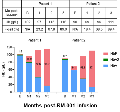 Data presented here for the first 2 TDT patients treated with RM-001. Both patients have β0/β0 genotype (CD17/CD41-42, CD41-42/CD41-42), with an annualized packed red blood cell (pRBC) transfusion history of 39 units/y and 54.8 units/y over 2 y prior to consent, respectively. Both patients received a single dose of RM-001 cells, ceased pRBC transfusions within 1 month after RM-001 infusion and remained transfusion-free through the reported period. The first patient (CD17/CD41-42, 9y) achieved neutrophil and platelet engraftment on Day(D+)19 and D+21; the other (CD41-42/CD41-42, 13y) achieved neutrophil and platelet engraftment on D+16 and D+21, respectively. No serious adverse event (SAE) occurred. The safety profile was generally consistent with busulfan myeloablation and autologous hematopoietic stem cell transplantation. Total Hb, HbF and F-cell percentage increased over time in both patients (Figure). Both patients received 6 units of pRBC before transfusion independent (TI) achieved (Hb stably ≥ 90g/L), with last pRBC transfusion on D+15 and D+28, respectively. The first patient achieved TI on D+28 and the other achieved TI on D+39. At 3 month post-RM-001 infusion, total Hb exceed 110 g/L in both patients, with 97-98 g/L HbF. Approximately 89% peripheral erythrocytes are F-cells at 3 month post-RM-001 infusion (Figure). Data will be updated for the presentation.