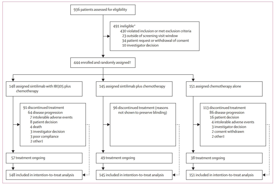 针对EGFR这条通路的靶向治疗药物革新了这部分患者的治疗选择,基于FLAURA研究为患者带来的PFS和OS的双重获益,奥希替尼这款三代靶向药物已获批在EGFR突变的晚期非小细胞肺癌患者中一线应用,然而耐药及疾病进展仍然不可避免。奥希替尼耐药后的相关研究仍在进行,但目前并无药物获得常规批准,因此,仍然代表了未被满足的临床需求。对于三代药物进展后的患者或一/二代靶向耐药后T790M突变阴性的患者,含铂双药化疗或联合贝伐珠单抗是标准的治疗选择,但疗效有限。此外,单药免疫治疗也很难给EGFR突变的患者带来相应的生存获益。本期的Lancet Oncology肿瘤展示了一项III期、双盲、随机对照研究的中期分析。这一研究纳入444例转移性EGFR的非鳞、非小细胞肺癌患者,所有患者均接受TKI类药物治疗后进展,患者随机分为信迪利单抗+IBI305+培美曲塞+顺铂或信迪利单抗+培美曲塞+顺铂或培美曲塞+顺铂,研究者报告了四药相较于两药所带来的PFS的获益,但是目前,三药相较于两药的数据并未公布。