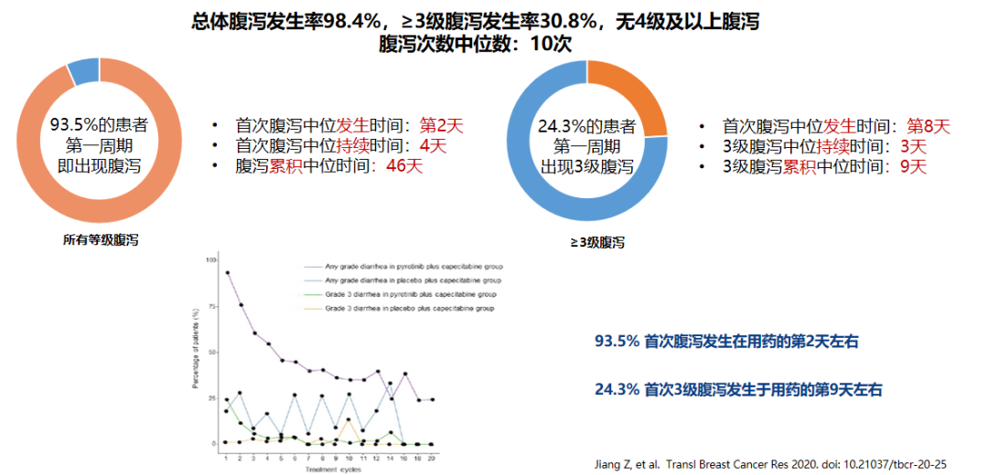 在本研究中,大多数患者出现吡咯替尼相关腹泻,且多数为1级。约10%的患者报告出现了3级腹泻,但可通过基于洛哌丁胺的治疗和二级预防进行管理。