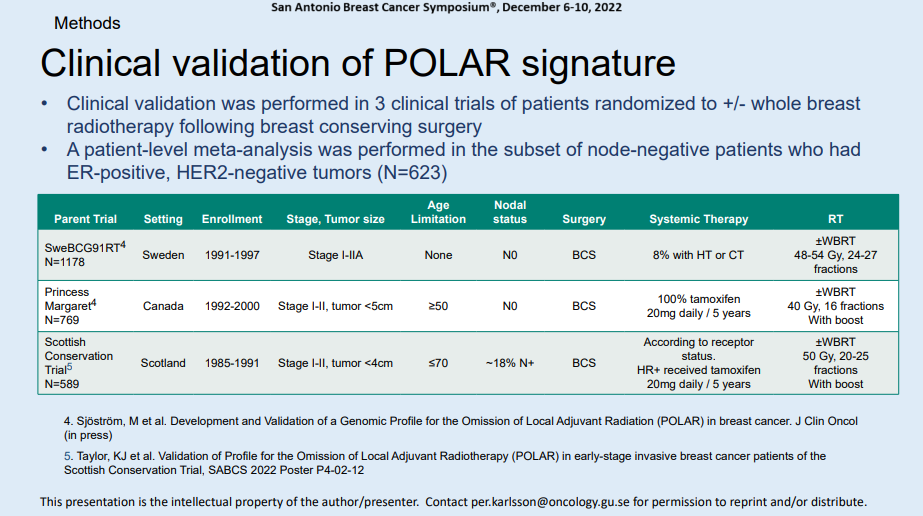 第三项的POLAR研究非常引人注目。该研究基于三个随机对照研究,对保乳术后是否豁免局部放疗的基因谱进行研究,这项研究是美国、瑞典、欧洲等几大中心的合作。研究首先建立名为“POLAR”的基因谱,然后通过临床验证POLAR。在前瞻性临床研究的样本或者数据库中,对数据库中涉及保乳术后淋巴结阴性激素受体阳性的患者荟萃分析,以观察POLAR是否能够帮助豁免放疗。