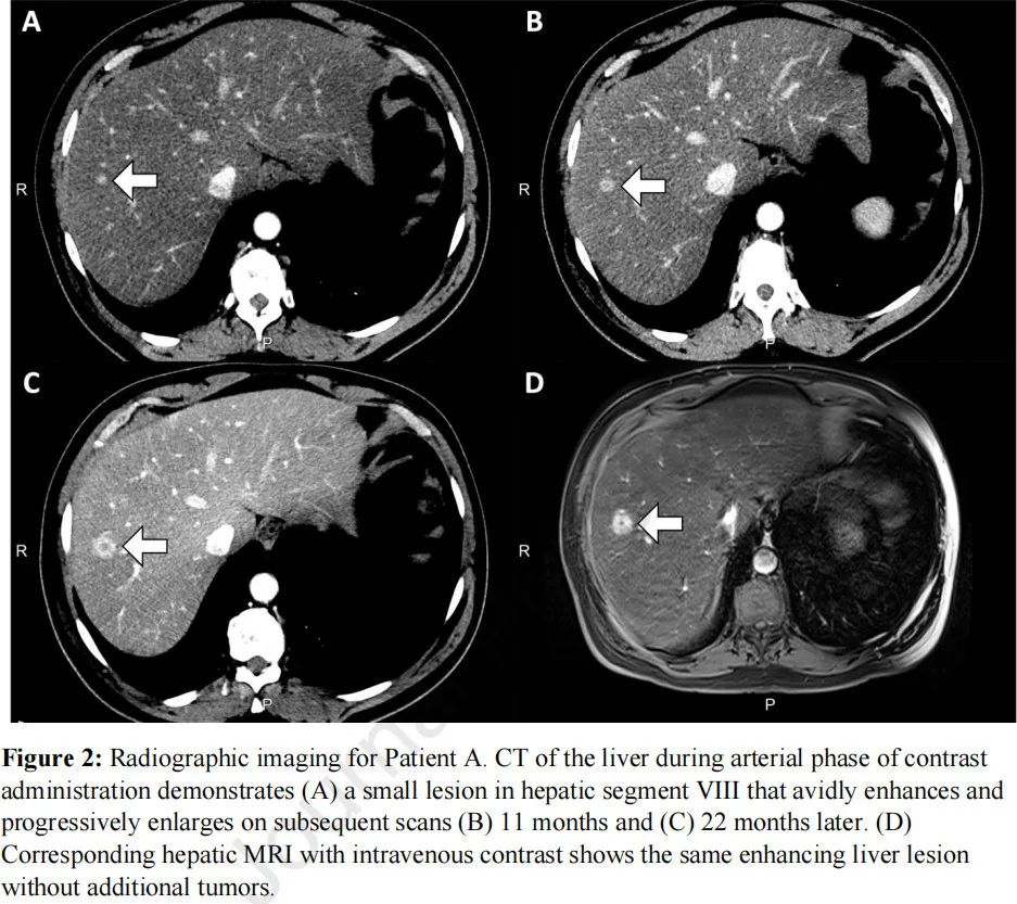 这两例患者都有HCC的显著风险因素。患者A在首次诊断为NSCLC时有肝脂肪变性和大量饮酒史,患者B有HCV病史和癌症家族史。这些风险因素中有几个与NSCLC的风险因素重叠,例如吸烟、饮酒或HCV感染史。这些病例强调了治疗肿瘤的同时也应考虑患者的整体状况。肺癌患者的生存持续改善,伴随而来的是并发原发恶性肿瘤的可能性增加。因此,在改变系统治疗方案之前,适当考虑进行基于组织的诊断评估变得更加重要。